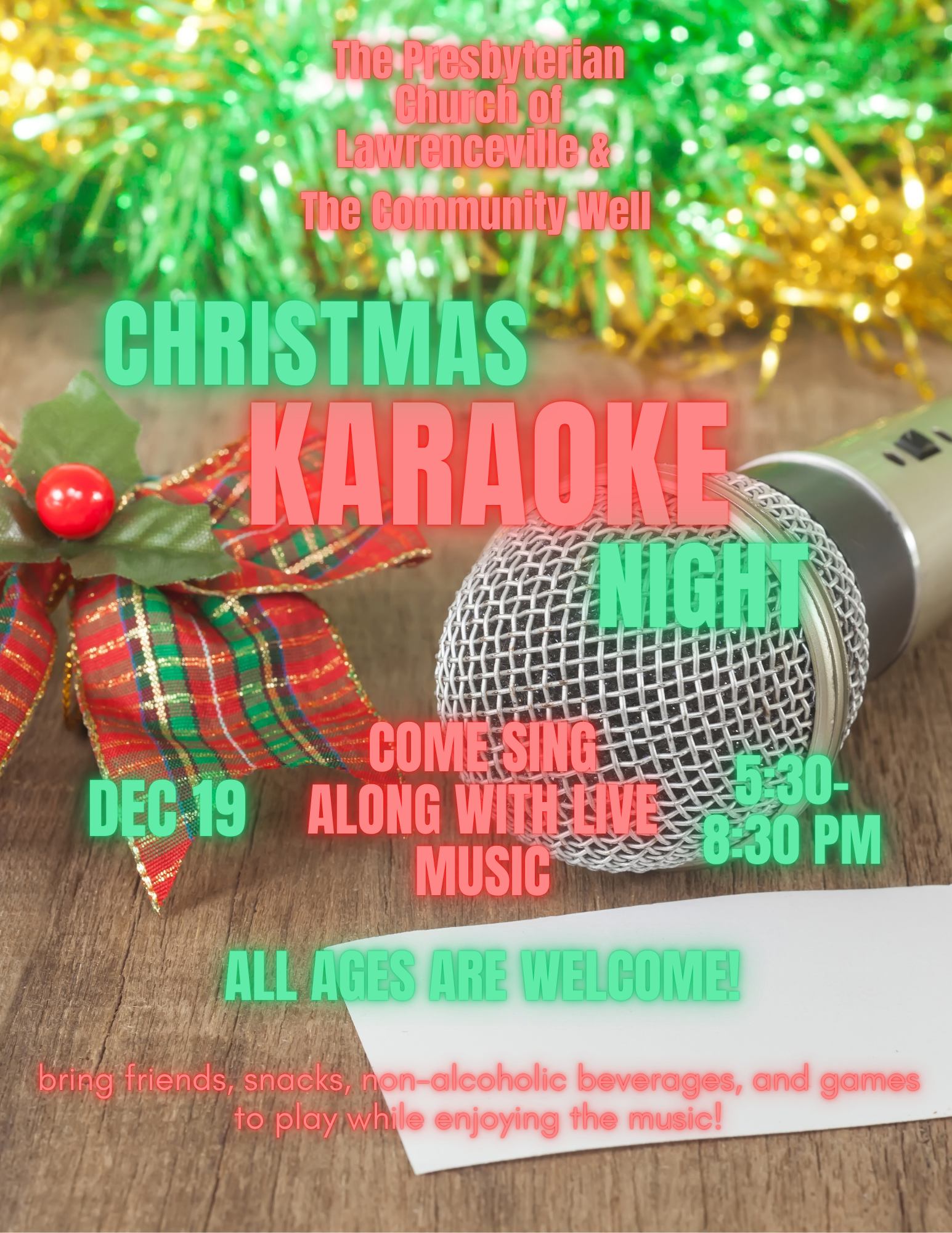 PCOL and The Community Well are excited to invite you to an all-ages Christmas Karaoke night! Come sing karaoke to live music!